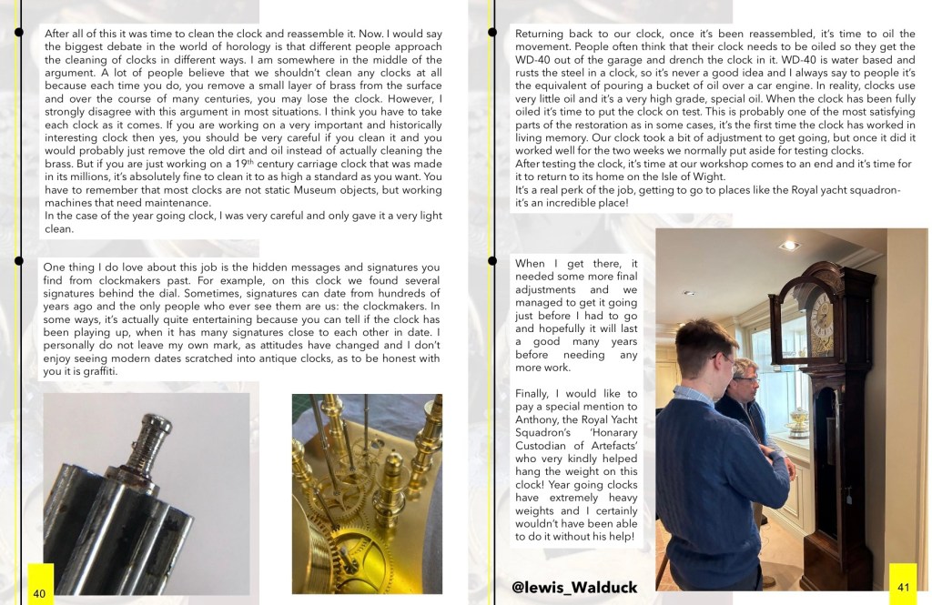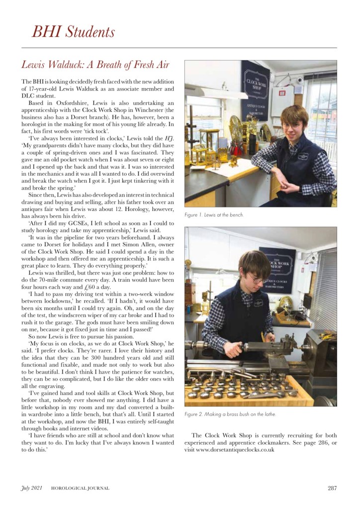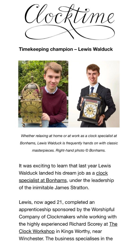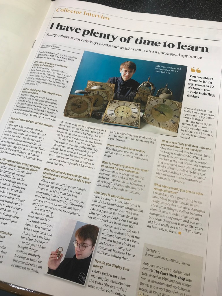 By 13, I was already managing a small antique fair in Buckinghamshire, which sparked my lifelong interest in all things antique. Over the years, I’ve developed a particular fascination with 17th- and 18th-century timepieces, which I find to be true works of art. This passion led me to pursue an apprenticeship in antiquarian horology at The Clock Workshop in Hampshire, where I had the incredible opportunity to work alongside Richard Scorey and receive support from the Worshipful Company of Clockmakers and the Queen Elizabeth Scholarship Trust. It was a challenging but deeply rewarding experience, and I’m forever grateful for the mentorship I received during that time.