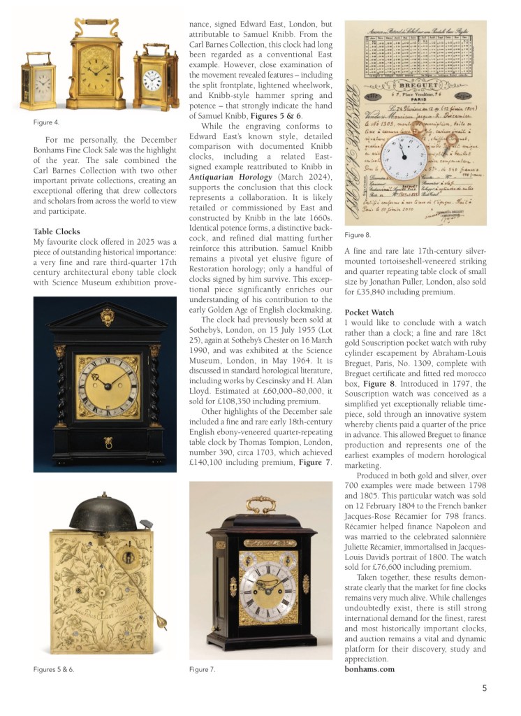 In 2024, I joined Bonhams as a specialist in the Fine Clocks Department at New Bond Street, a role that brings together everything I value about the field. My work involves researching, cataloguing, and valuing important timepieces, often by the great makers of the English golden age, Thomas Tompion, George Graham, and Joseph Knibb among them. Handling such objects daily, and helping place them into new custodianship, remains a genuine privilege. One particular highlight was the identification and attribution of a previously unrecorded Samuel Knibb table clock which sold for £108,350 inc. premium This important discovery expanded the known corpus of Knibb’s work from five recorded clocks to six, significantly broadening scholarly understanding of the maker.